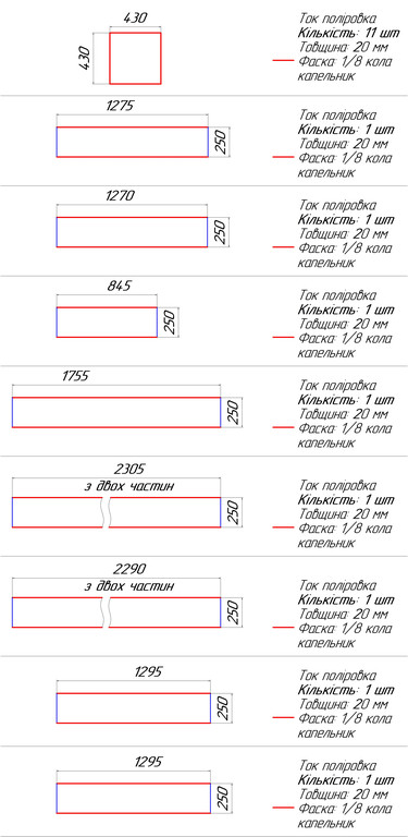 Квадратні кришки на стовпчики та довга накривка (парапет) з токівського граніту з фасками і капельником